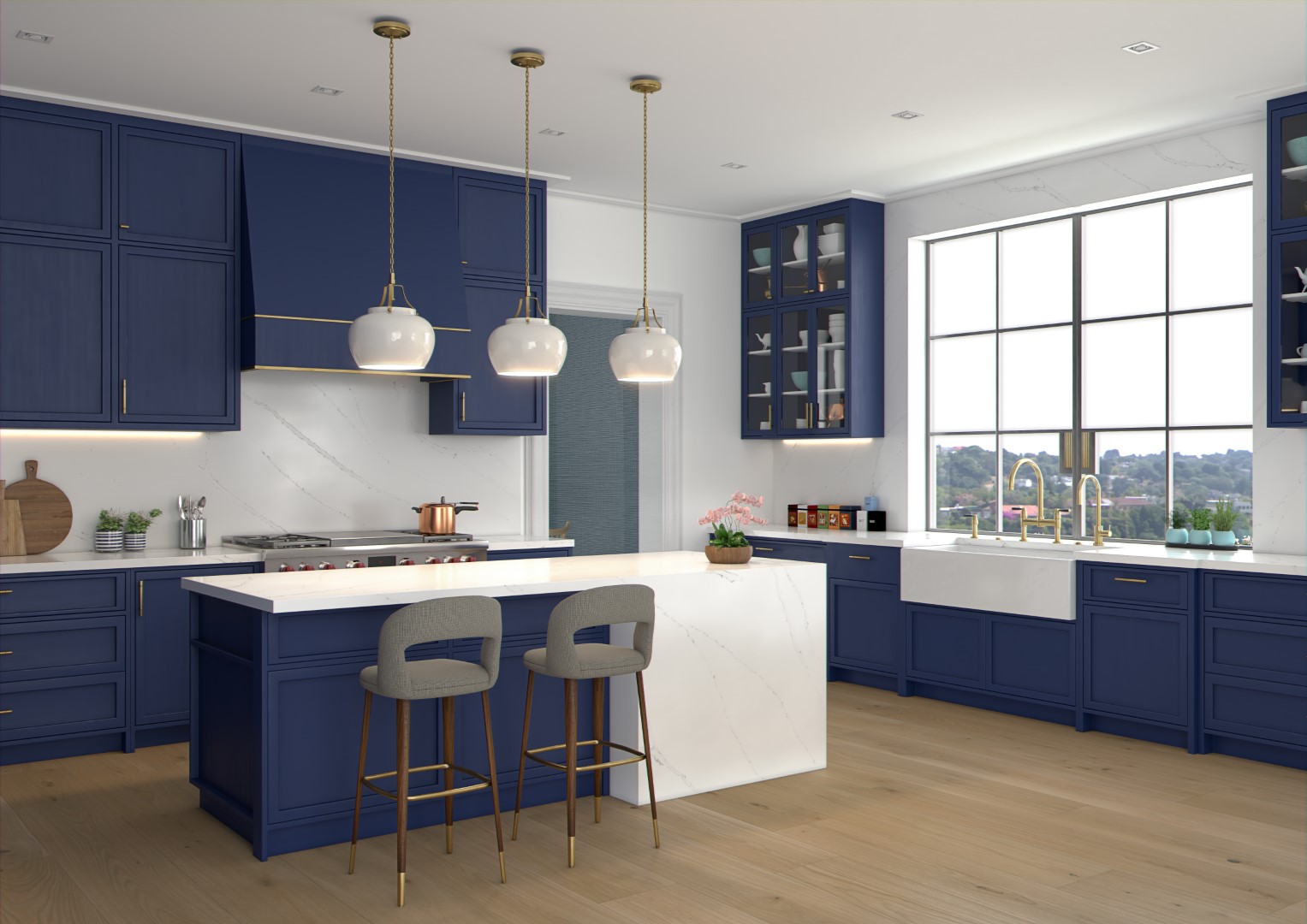 İyi aydınlatılmış ya da güneş alan mutfaklarda, uygun renklerle kullanıldığında doğal görünümlü ve ferah bir atmosfer yakalayabileceğiniz Calacatta Veneto tasarımı, koyu mavi ile kullanıldığındaysa kesinlikle doğal ve organik görünüyor. Daha sıcak bir hava katmak için altın sarısı, daha “cool” ve profesyonel bir hava katmak için gümüş rengi dolap kulplarıyla ve mutfak muslukları ile taçlandırabilirsiniz. Özellikle bu tasarımda, mutfak tezgah arasında da Calacatta Veneto’nun kullanılması, mutfağa bir devamlılık, organik bir doku ve modern bir görünüm kazandırmış.