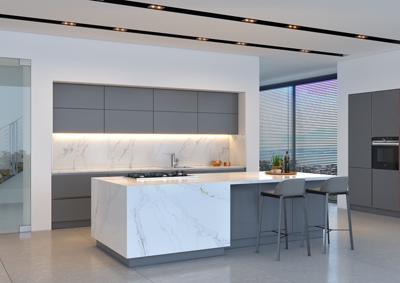 Mutfak dolaplarında kullanabileceğiniz gizli aydınlatmalarla da Calacatta Victory’nin kendine özgü ışıltısı öne çıkarabilir, böylece mutfak dizaynınızda mükemmel bir bütünlük yakalamış olursunuz.