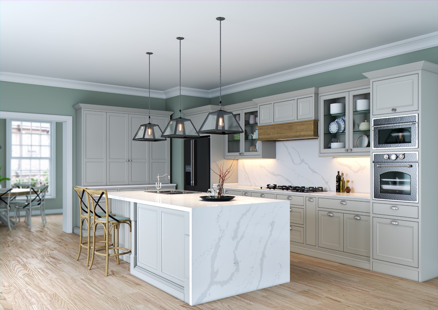Calacatta Venezia ile her renk ve desen uyum sağlayabilir ama bizim favorimiz kesinlikle su yeşili tonlarında duvarlar, açık renk ahşap parke zemin ve gri mutfak dolapları bir araya getirilerek doğal dokuların göz önüne serildiği bu tasarım.